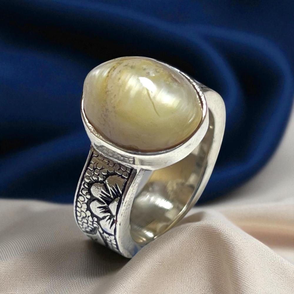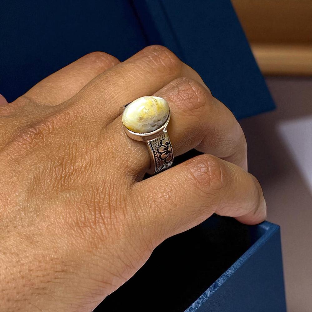 خاتم مميز بحجر عين الهرة الطبيعي باللون الأصفر العسلي مع لمعة متغيرة، يتميز بتأثير بصري فريد يشبه عين القطة عند انعكاس الضوء.