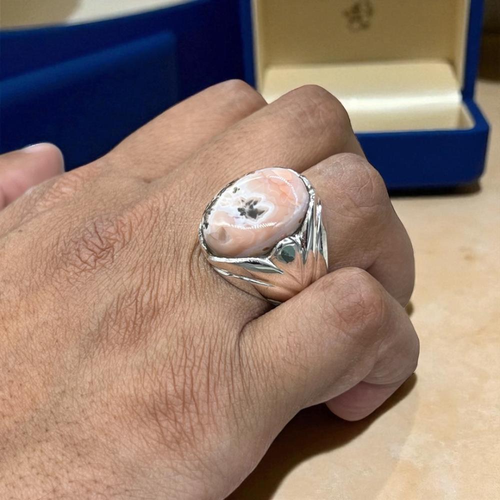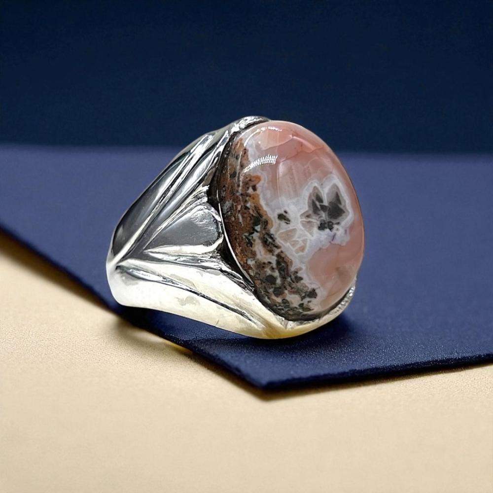 خاتم رجالي مميز بفص عقيق طبيعي وردي ذو نقوش طبيعية ساحرة، يضفي لمسة من الفخامة والندرة.
