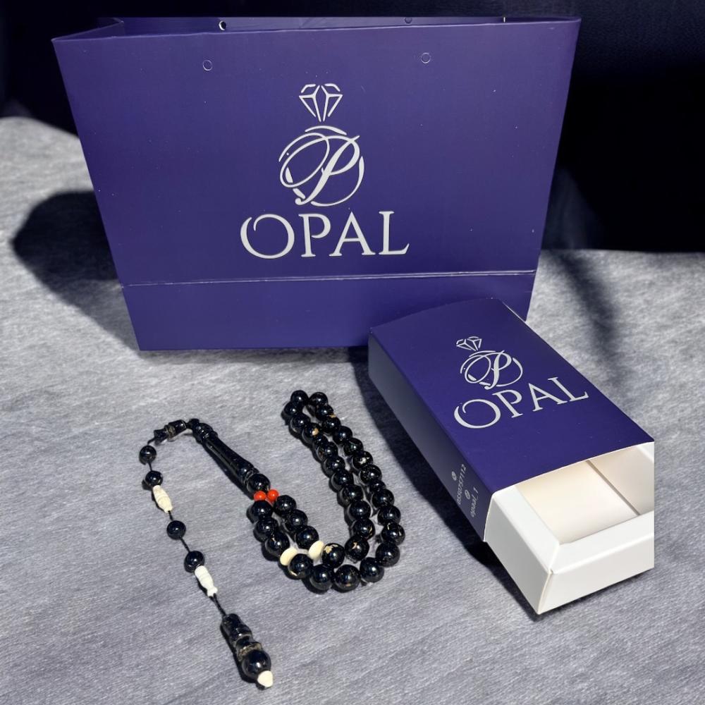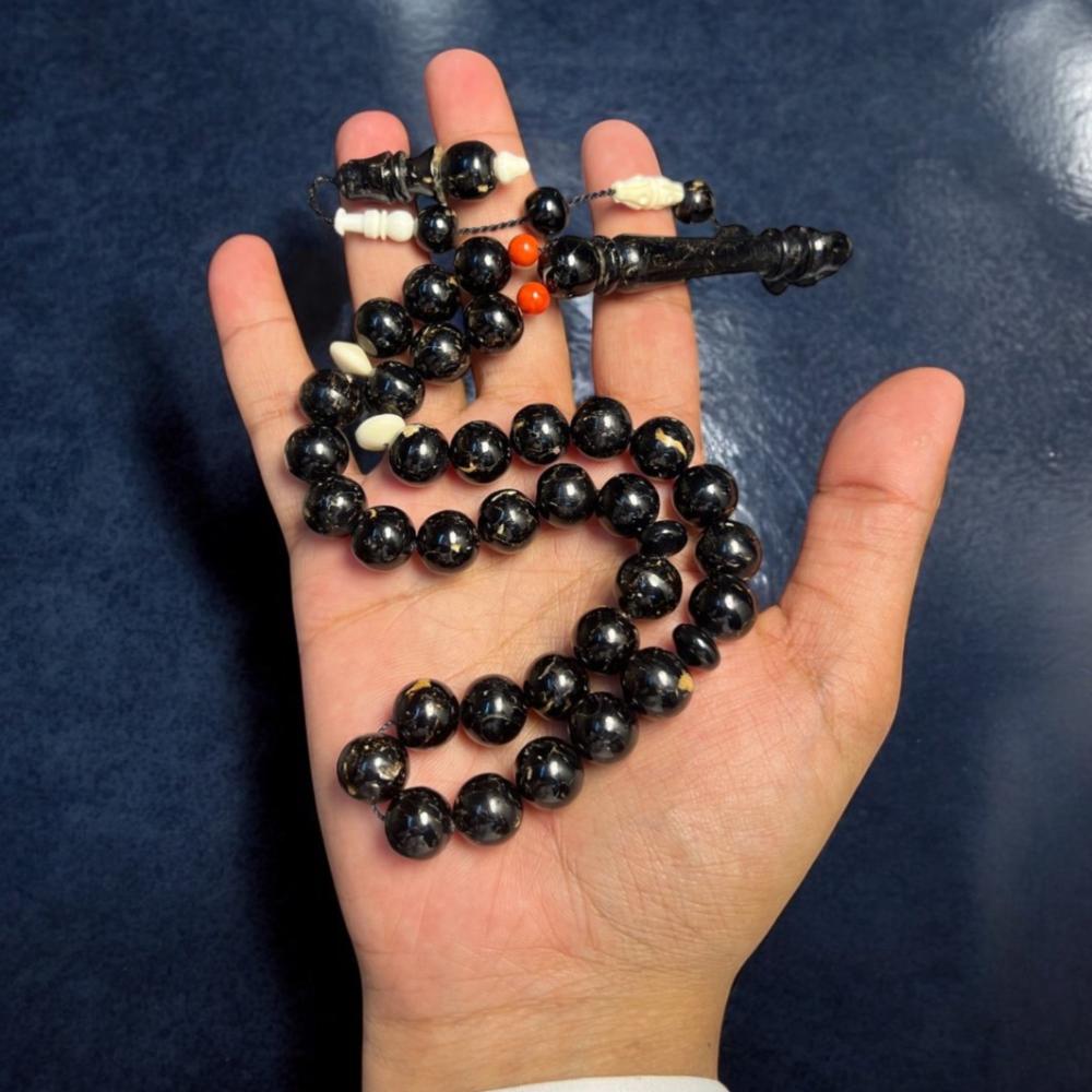 هذا المزيج بين سواد يسر البحر الأحمر ونقاء عاج الفيل الطبيعي يخلق تباينًا أنيقًا وجذابًا. العاج يضفي لمسة من الفخامة الكلاسيكية والأصالة على المسباح، بينما يحافظ ال يسر على طابعه الروحاني العميق.