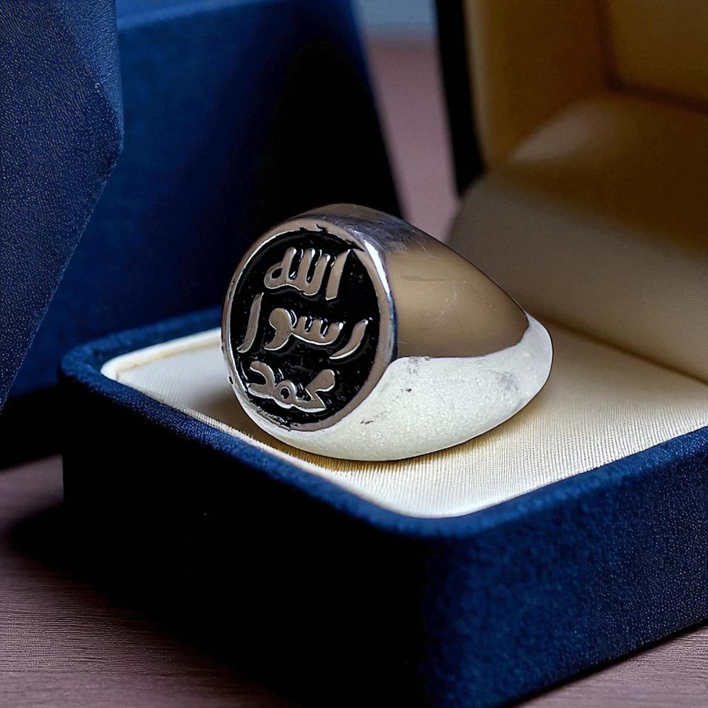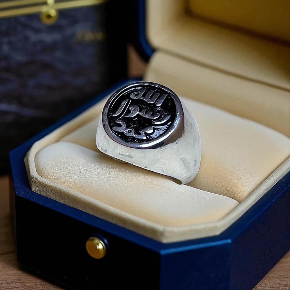 خاتم رجالي أنيق مصنوع من فضة 925 بتصميم مستوحى من النقش الشريف “محمد رسول الله”. يحمل في مظهره رمزًا إيمانيًا عظيمًا يعبّر عن الفخر والاعتزاز، مع لمسة جمالية كلاسيكية تناسب كل الأذواق.