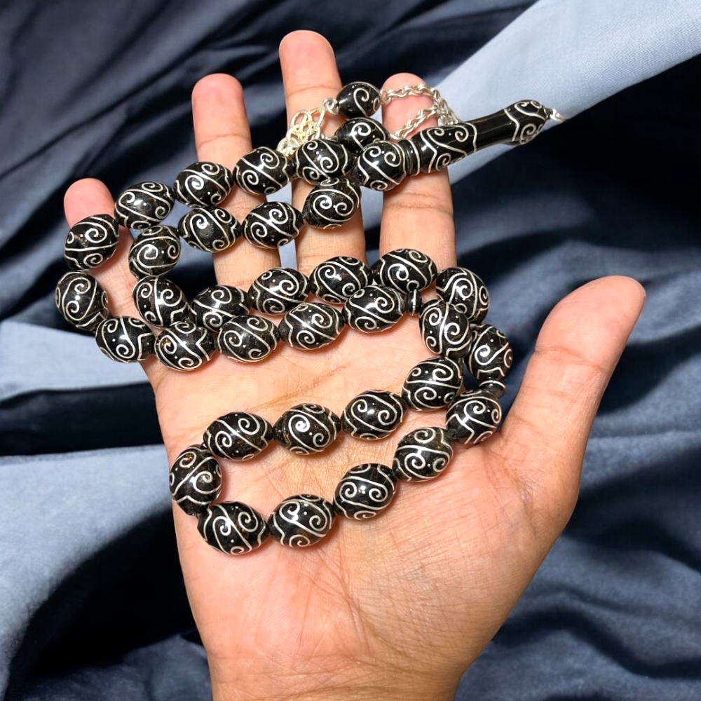 مسباح فاخر مصنوع من يسر البحر الأحمر الطبيعي، مطعّم بلمسات فضية أنيقة تضفي عليه طابعًا من الرقي والفخامة.