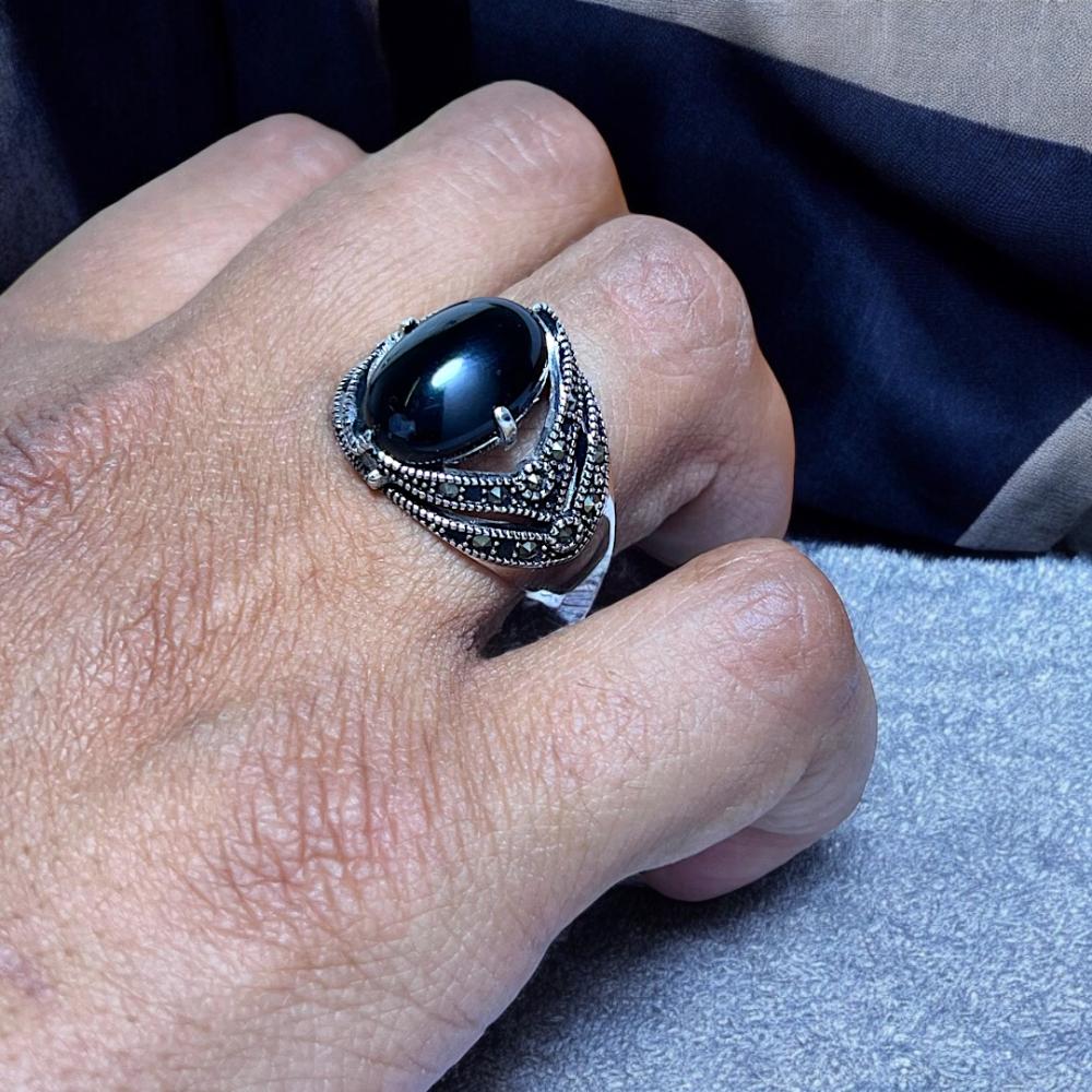 خاتم العقيق الأسود الملكي – حجر عقيق طبيعي بلون أسود لامع بحجم كبير، بصياغة فاخرة من فضة 925 وتطعيم دقيق بفصوص الماركزيت. تصميم كلاسيكي يعكس القوة والهيبة، مثالي لهواة التميز والقطع النادرة.