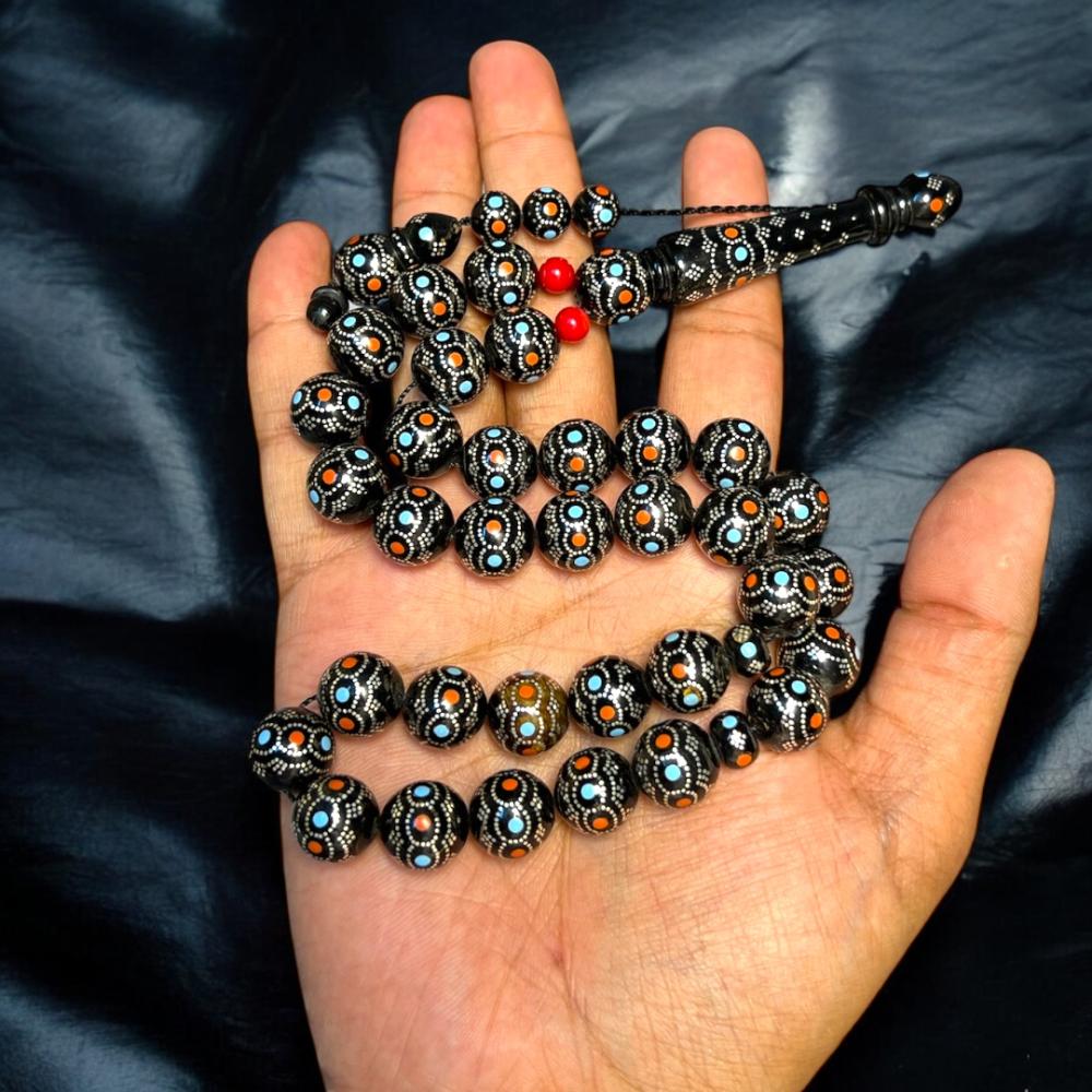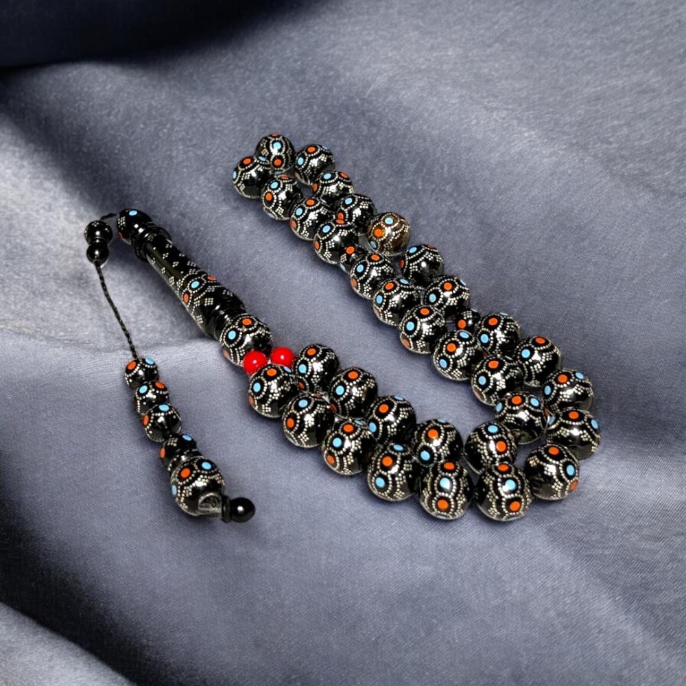 * الأحجار الكريمة: ترصيع بأحجار كريمة أو شبه كريمة، مثل الفيروز، العقيق، الياقوت، أو غيرها، مما يضيف قيمة جمالية وروحانية للمسباح.