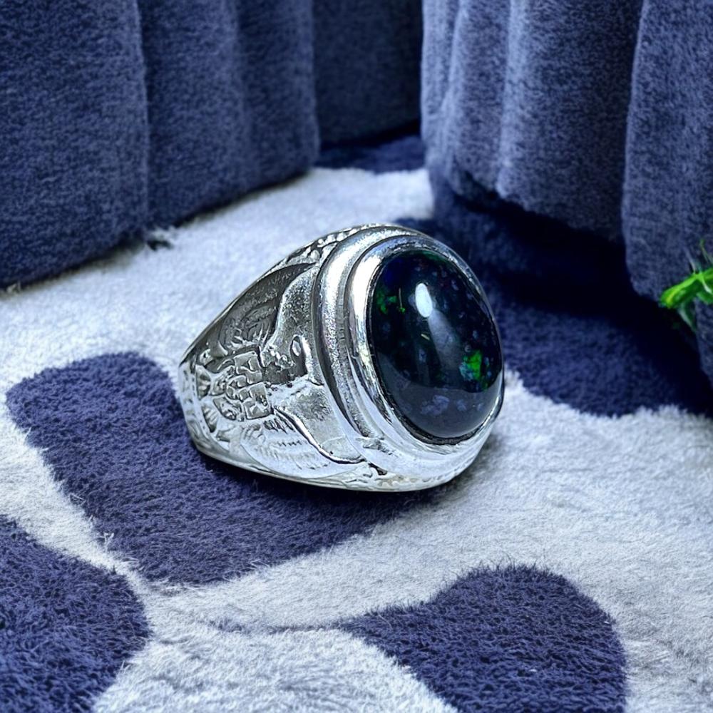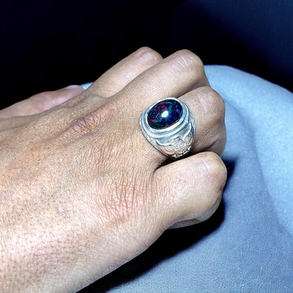هذا الخاتم ليس مجرد قطعة مجوهرات، بل هو قطعة فنية فريدة تعكس الذوق الرفيع. الأوبال الأفريقي الأسود بفايره الأحمر يضيف لمسة من الغموض والجاذبية، بينما تضمن الصياغة الفضية الخفيفة والمريحة الراحة التامة. إنه خيار مثالي لمن يبحث عن خاتم يجمع بين الأناقة، الراحة، والتميز.