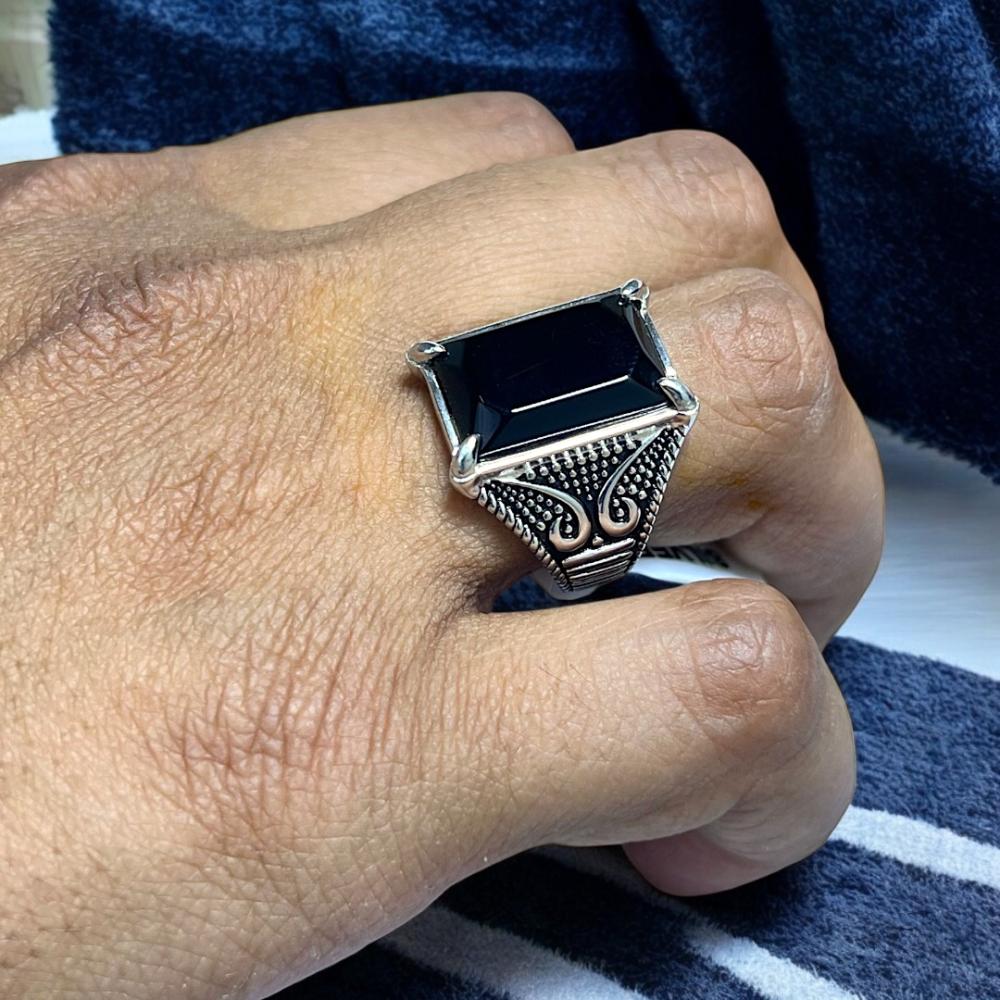 خاتم فخم بتصميم رجولي جريء، يتوسطه حجر مستطيل أسود لامع يعكس الهيبة والغموض، محاط بتفاصيل دقيقة محفورة يدويًا على الفضة عيار 925.