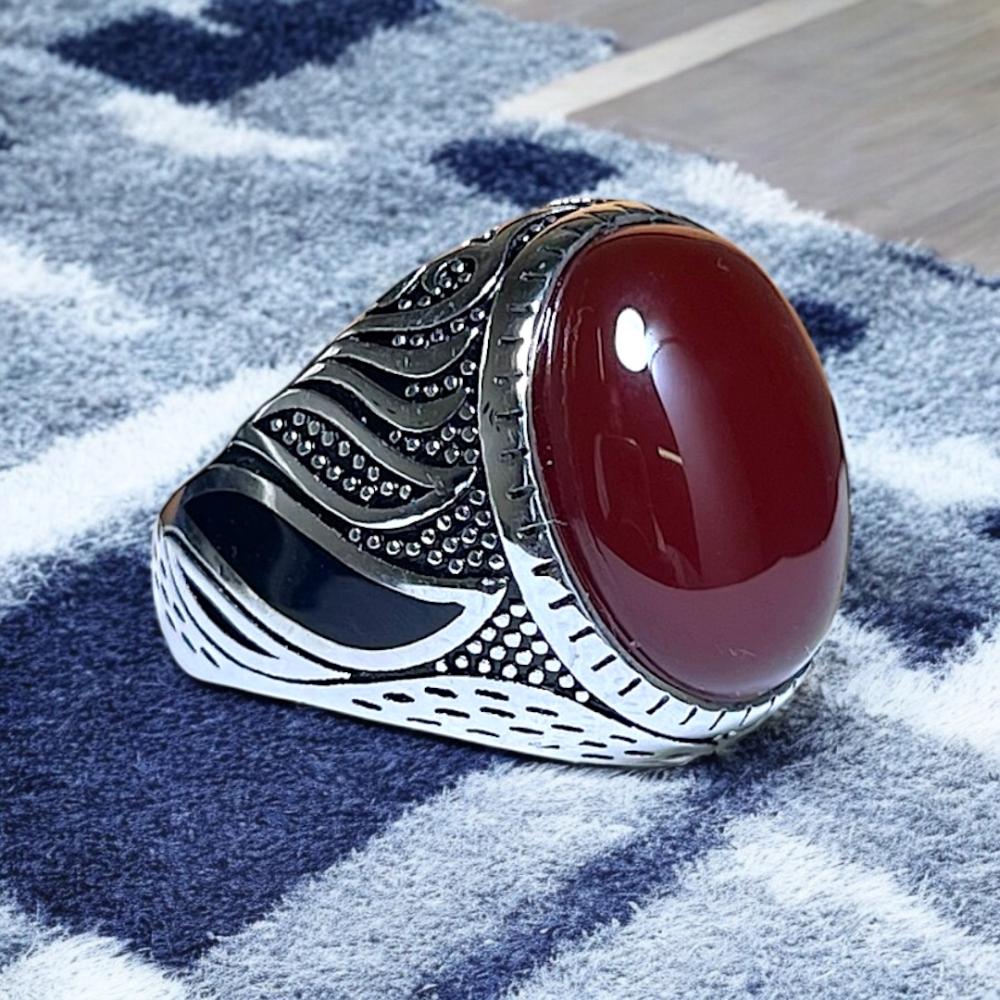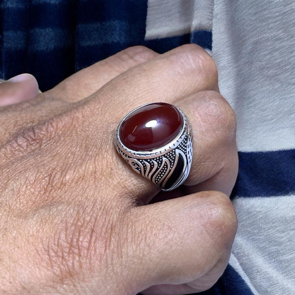 خاتم عقيق كبدي طبيعي بلمعة فاخرة، مصاغ يدوياً من فضة 925